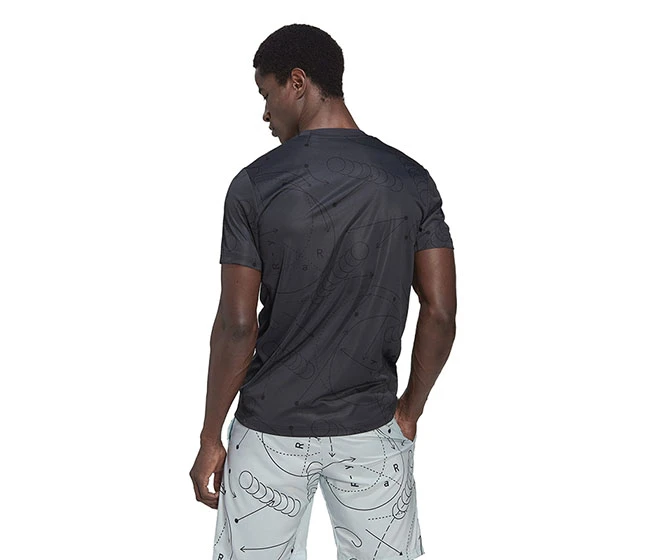 Keep all angles covered when you hit the court. Behind its allover geometric print, this adidas tennis tee is built to support polished performances. Underarm gussets allow full shoulder rotation for ferocious smashes and majestic ground strokes. AEROREADY wicks moisture to reduce unwanted distractions. Made with 100% recycled materials, this product represents just one of our solutions to help end plastic waste.