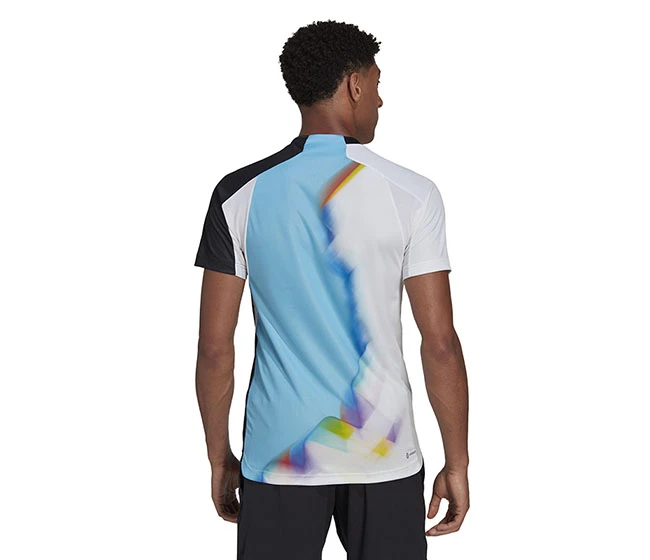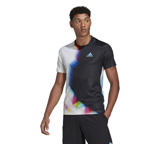 A nod to the beautiful game’s biggest tournament. From its ribbed collar down to its droptail hem, this slim-fitting adidas tennis tee takes its design inspiration from the jerseys you’ll see on the football pitches of Qatar. It also shares their breathable mesh inserts and cooling HEAT.RDY, so you can put everything into your game on the hottest days.