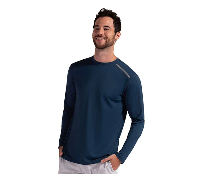 The BloqUV 50+ UPF men’s Jet Long Sleeve Tee is sun protection to be worn alone, as a base layer, swim shirt, rash guard or beach cover up. The long sleeve performance SPF tee offers comfort, freedom of movement and is perfect for running, biking, swimming, boating, skiing, tennis, golf, working out or just looking sharp at leisure.