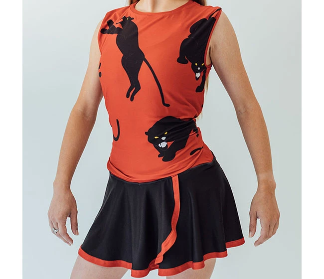 Another fierce ensemble co-created with pro pickleball duo Anna Leigh and Leigh Waters. The Black and Red Stripe Holly Skirt was designed to go perfectly with the Faye+Florie Red Panther Muscle Tank. The Holly Skirt is an elegant and polished way to gracefully move around the court. This style looks great on every body type and has a beautiful draping over hips and butt.