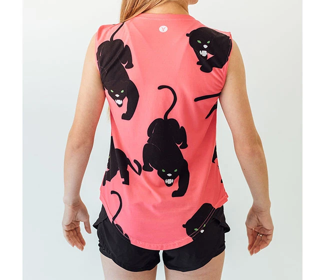 Let your wild side show with the Pink Panther Muscle Tank from the Faye+Florie Jungle Line. New to the Faye+Florie 2022 line up is the very flattering Muscle Tank. A little feminine, a little tough, an overall perfect fit. The top features a full coverage neck and back and protects your shoulders from that summer sun. The bottom hem has a slight curve in the front and back and will fall to the perfect length.