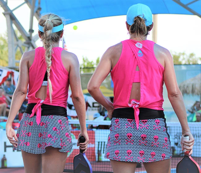 All Faye+Florie skirts feature a consistent fit due to the universal built in shorts. Made from a moisture wicking polyester spandex blend, the 4 inch wide elastic free waistband feels smooth and soft against your skin as it holds you in and streamlines your silhouette. Because the extra wide waistband and built in shorts are one piece, each skirt falls from the same place on your body for a consistent and comfortable feel no matter which style you wear. Soft Silicon Faye+Florie grip lightly hugs your thighs to keep your shorts in place as you move while leaving plenty of room for tennis balls. The triangle gussets helps prevent chafing even during the most intense play.