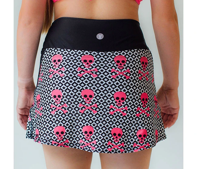 Another amazing design from the Waters Line by Faye+Florie. Bright pink skulls overlay black and white alternating stars to create a print with depth and movement. Pair this edgy print with a Launch Pink, Black or White Tie Back to complete the outfit.
