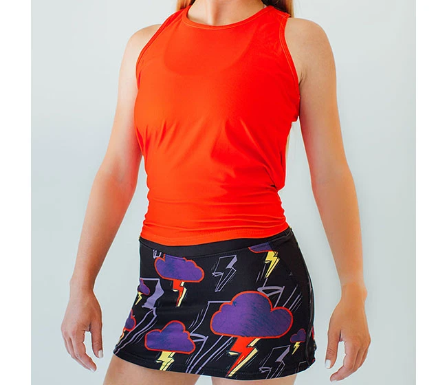 Vibrant Red will make your outfit pop on the court when you pair it with the Faye+Florie Waters Collection Purple Cloud print skirt. This cozy and and buttery soft poly/cotton blend feels so light and comfortable against your skin. The stylish tie in the back allows for an adjustable fit and a chic look.