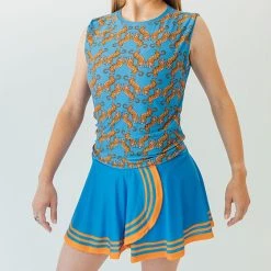 Looking for your spirit animal? Look no further than the Blue Tiger Muscle Tank. This print features interlocking ferocious orange tigers against a bright blue background. Pair it with the Blue and Orange Tiger Stripe skirt to complete the look. Made with 100% polyester moisture-wicking material, this top will keep you cool and comfortable. With a drop tail hem, the Muscle Tank can be worn tucked in or out. Co-designed and worn by mother-daughter pickleball champions Leigh and Anna Leigh Waters.