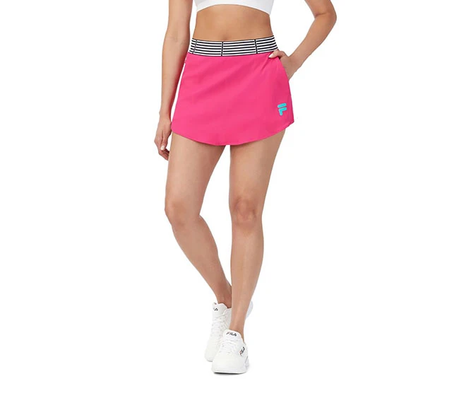 Bring trendy style to the court with the FILA Bevans High Waist Skort. Designed alongside US fashion designer Christopher Bevans, this 14.5 inch length skort features an exposed elastic waistband, integrated shortie, front angled pockets, glossy F-box logo, and a FILA x BEVANS interior label.
