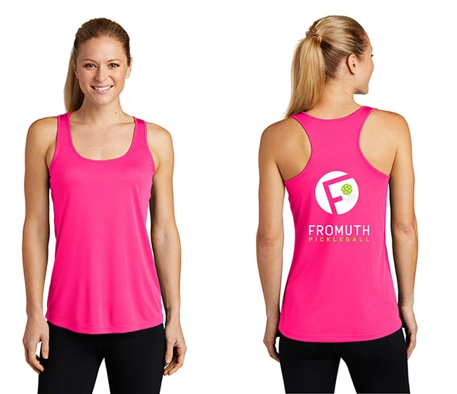 Perfect for the practice courts, the Fromuth Pickleball Circle Logo Racerback tank top shows you where hard work can lead. The racerback design and moisture-absorbing fabric keep you comfortable and confident and graphics on the front & back let you show off your love of pickleball. A layerable, moisture-wicking must-have!