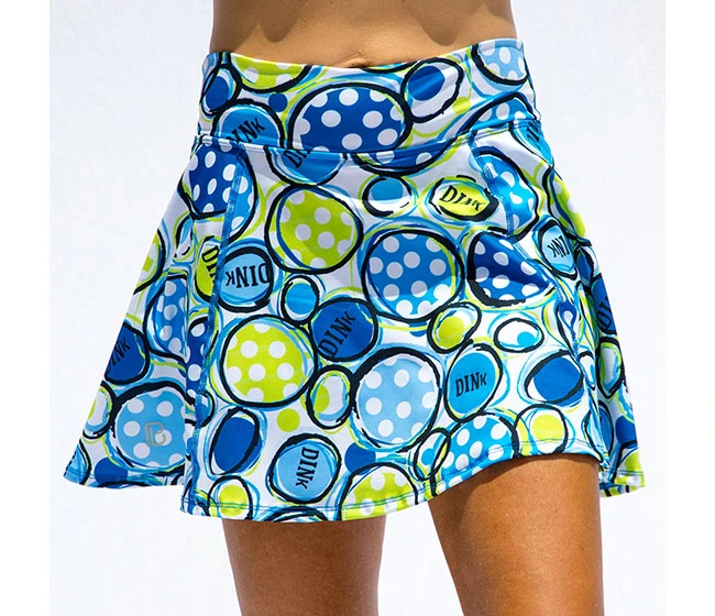 Dink 1 print was Pickleball Bella’s design and to date, the most popular featuring pickleballs in shades of blue with a pop of lime green pickleballs all outlined in black on white background.